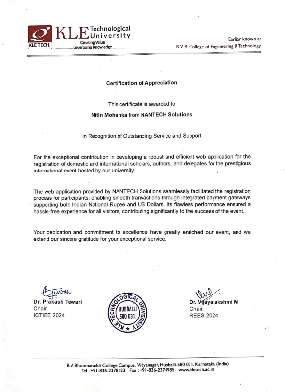 Certificate of Appreciation by KLE Technological University